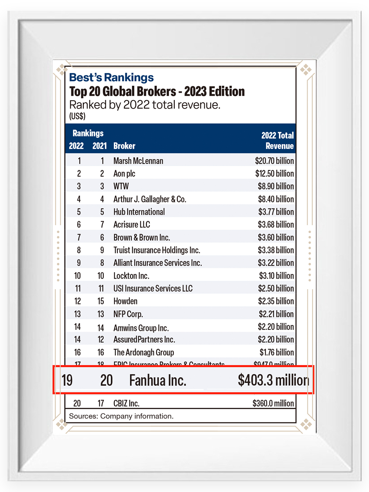 泛华入选国际权威评级机构贝氏《全球顶级保险经纪商排名- 2023年版》,位列第19名
