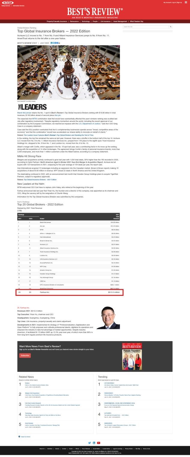 7月5日,国际权威评级机构A.M. Best (贝氏)正式发布《全球顶级保险经纪商排名- 2022年版》,贝氏确认泛华控股集团(以下简称“泛华”)全球排名,以5.133亿美元的总收入上榜,位列第20名。