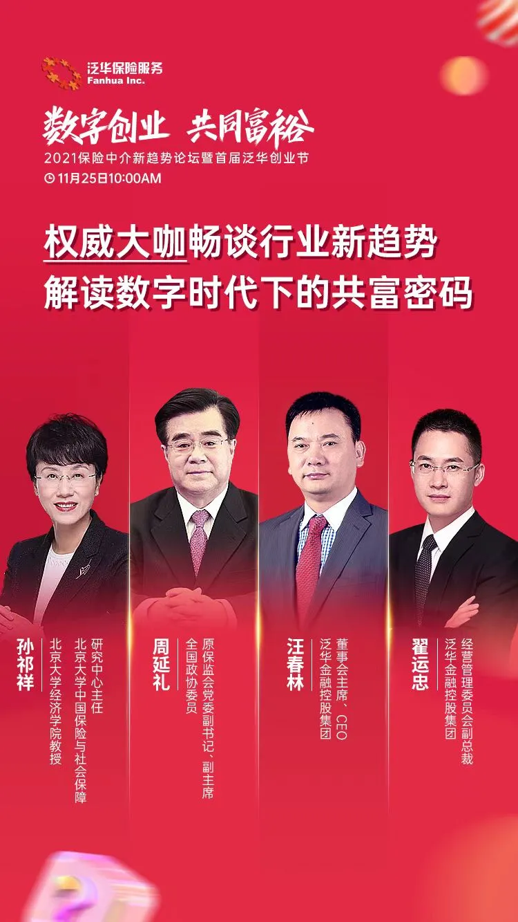 峰会将特别邀请原保监会党委副书记、副主席、全国政协委员周延礼;北京大学经济学院教授、北京大学中国保险与社会保障研究中心主任孙祁祥连线泛华直播间,从众多视角共同探讨保险行业未来的发展新趋势,解读数字时代下的共富密码。