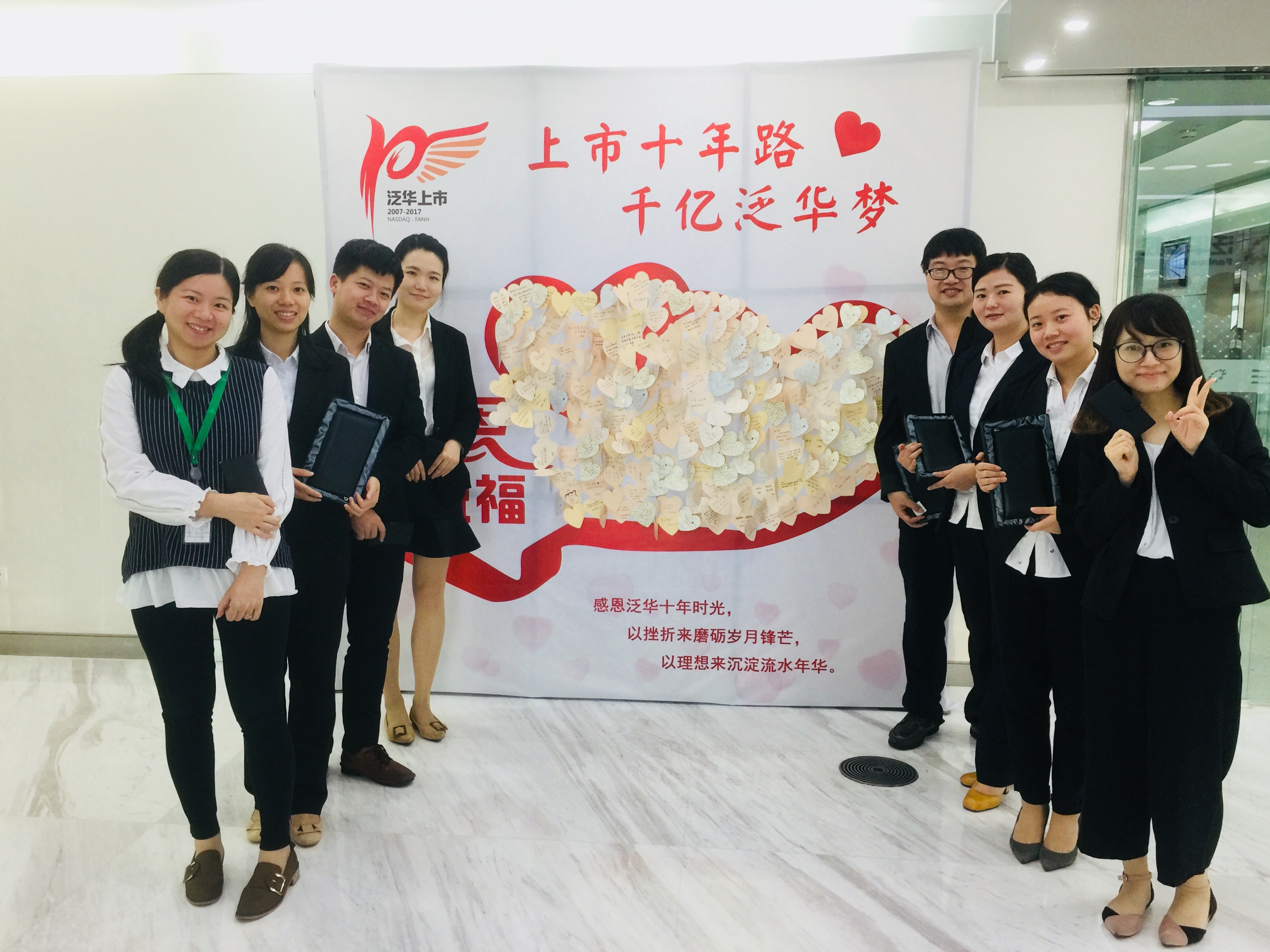 在这个普天同庆的日子,泛华人的祝福也如千军万马般奔腾而来。集团总部的泛华人在祝福墙上,写上对泛华上市十周年的祝福,寄语泛华未来,祝愿泛华基业长青。活动期间举行了抽奖活动,并送出了精美的礼品。