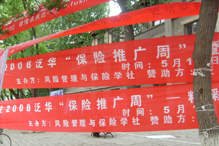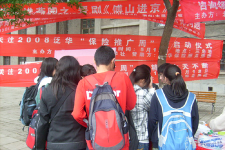 为了推广先进的保险理念、向年轻一代普及更多的保险知识,同时增强人们的保险以及风险管理意识,泛华与北京大学联合举办的“北大泛华保险推广周”在北大燕园圆满落下帷幕。此次保险推广周从5月12日开始一直持续到18日,历时8天时间。在8天时间里,也是汶川地震发生的时间里,泛华联合北京大学给广大师生、广大周边学校清华、中国人民大学、对外经济贸易等大学师生甚至周边群众带来了一个具有特殊意义的保险宣传周。
