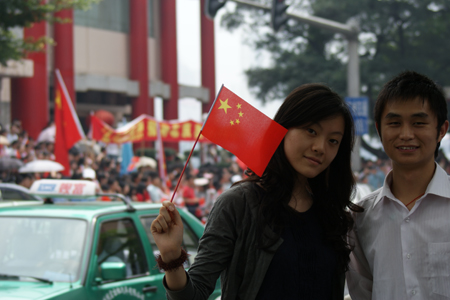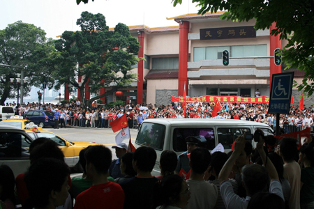 现场人数比想象的还要多很多,老人、小孩、妇女、学生、上班族……,人们的热情比想象得还要更加热烈,人挨人、人挤人、汗流浃背、却抑制不住内心的激动和喜悦,每到一辆排头车都能引起人们的一片欢呼。当圣火到达天字码头站交接传递的时候,人们的热情一触即发,不约而同的高呼:中国!加油!中国!加油!……这群可爱的中国人分不清种族和地域,也分不清男人还是女人的声音,都淹没在祝福中国奥运的声海中。