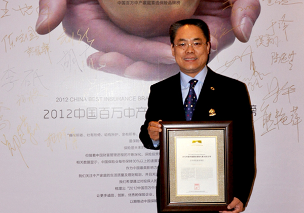 图为泛华寿险营业集团常务副总裁刘全杰领取“百万中产家庭首选保险品牌”证书。