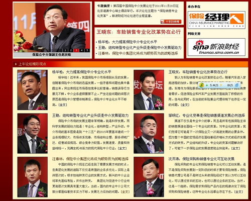 2011年11月20日,第四届中国保险中介发展论坛在北京港澳中心瑞士酒店召开。本次论坛受到中国保监会和各地保监局的高度重视,保监会法规部杨华柏主任、中介部赵庆晗副主任与河北、辽宁、广西、厦门、西藏等地的保监局领导,以及保监会中介部的施强处长、龙翔处长、朱英桃副处长和全国各地保监局中介处负责人一起与会。泛华集团CEO汪春林先生受邀与中外保险公司及中介机构的代表、专家学者等200位各界嘉宾一起参会,他还做了主题演讲。和讯、新浪、中国保险报等各大媒体都专题报道了论坛实况。(,)
