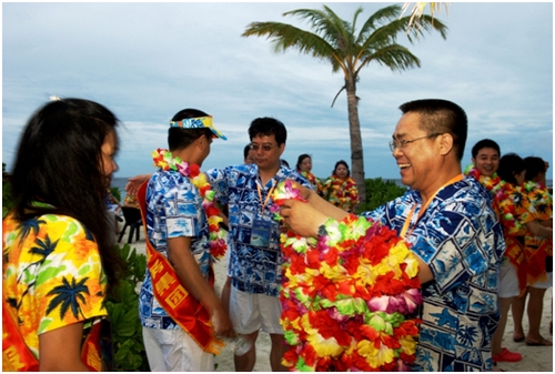颁奖结束后,在落日的余辉中,表彰晚宴开始。晚宴上不仅有乐队的即兴演出,还有来自各省公司表演的精彩节目,而最令人们激动的是来自总裁室和保险公司嘉宾们表演的草裙舞,将晚宴推向了高潮……