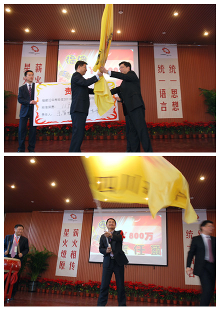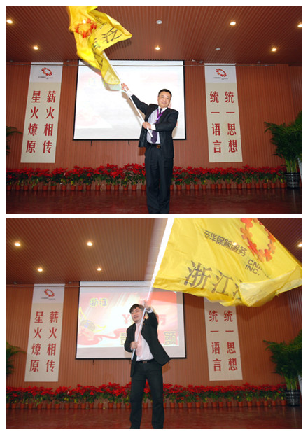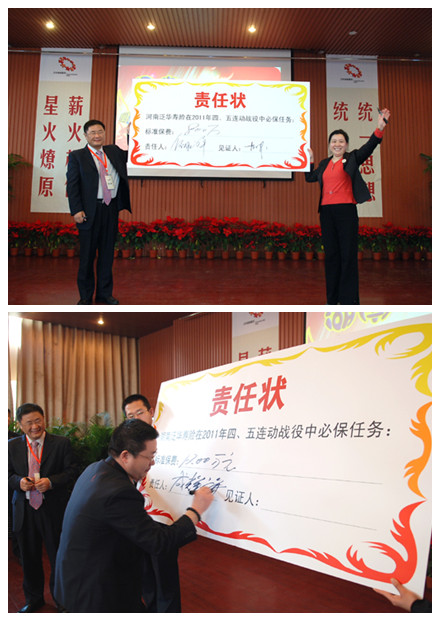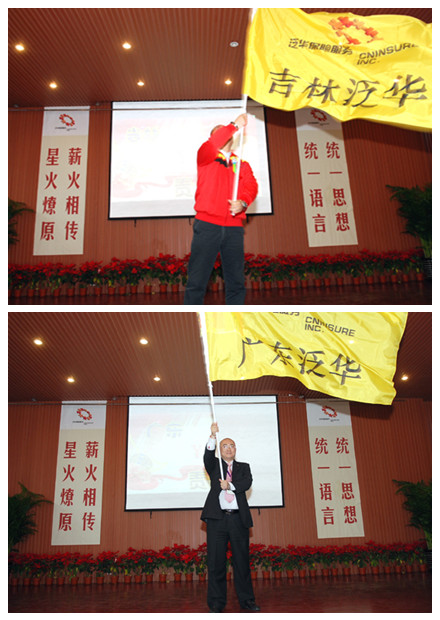 在会议结束的当天,寿险管理总部特别召开了“四五连动”启动大会和誓师大会。这下全场可就热闹开了,经过前两天的培训,这些创业团队长 “充电”后就积蓄了一身儿的干劲儿。誓师大会上,刘全杰副总裁发起动员令、搭起了擂台让各省都来比一比。