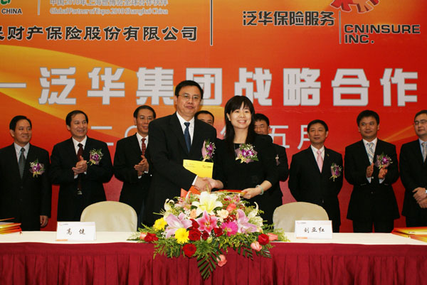 2010年5月13日,中国人民财产保险股份有限公司与泛华保险服务集团在广州举行了战略合作协议签字仪式。中国人保财险降彩石副总裁与泛华集团胡义南董事长出席仪式,并代表双方公司共同签署了合作协议。(专题链接:)