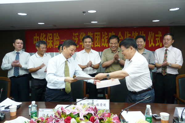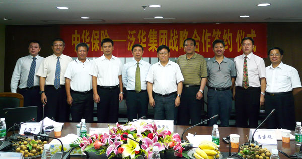 2009年7月29日,中华联合财产保险股份有限公司与泛华保险服务集团总对总战略合作签约仪式在广州隆重举行。中华联合财产保险股份有限公司董事长张崇进、副总裁郭保成、副总经理龚贻生,泛华保险服务集团总裁赖秋萍、副总裁兼财险营业集团总裁汪春林、泛华公估集团董事长吴德华,以及双方总、分公司相关领导出席了战略合作协议签字仪式。