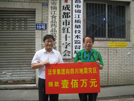 日前,四川灾区重工作正在紧锣密鼓地进行,为了进一步援救灾区同胞,帮助更多的人重建家园,尤其是帮助那些失去校园的孩子们,5月30日,泛华集团董事长胡义南在四川泛华各保险和金融机构领导的陪同下来到成都红十字会,代表泛华集团向灾区捐款人民币100万元,支持灾后学校的重建工作,成都红十字会秘书长郭勇强先生接受善款并致谢。