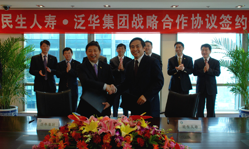 2008年4月11日,泛华保险服务集团与民生人寿保险股份有限公司在民生人寿大厦签署了战略合作协议。民生人寿保险股份有限公司总裁段景泉先生,总裁助理李越先生,泛华保险服务集团总裁赖秋萍先生,副总裁、寿险事业部主席李成斌先生,副总裁、寿险事业部副主席金锋先生出席了签约仪式。