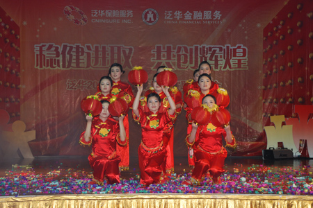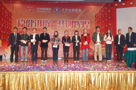 元宵节举办大型表彰晚会作为泛华有始以来的传统已经举办了10届,目的在于通过晚会表彰在一年里辛勤付出的泛华员工。此次表彰晚会共表彰了全国11个省市泛华保险新星、银星、金星、服务明星、优秀经理人、泛华年度之星等61个泛华年度保险个人;泛华金融最佳新人、年度精英、年度钻石之星、优秀经理人等40个泛华年度金融个人,以及泛华保险年度8个优秀团队和泛华金融年度3个优秀团队。其中,胡董带领的上市工作小组获得了2007年度团队大奖。泛华如此多的荣誉及奖励是对泛华每位员工一年里辛勤付出的充分肯定,每年的元宵节也成了泛华集团上下一起欢庆的日子。