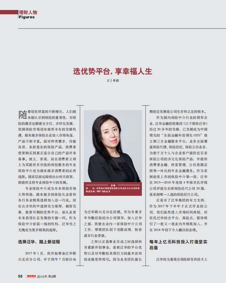 2017 年 1 月,我开始筹备泛华联兴北京分公司,并于同年 7 月被任命为泛华联兴北分总经理。作为有着多年外勤经验的分公司领导,加入泛华之前,我曾在业内一家保险中介公司工作,带领团队创下亮眼成绩,斩获诸多行业荣誉。