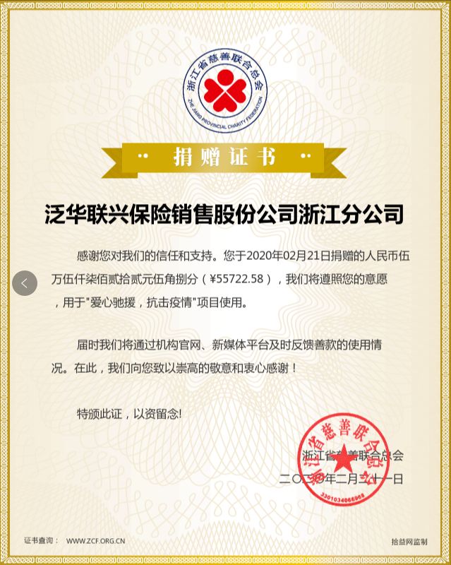 浙江泛华率先向杭州红十字会捐款10万元用于采购抗疫一线人员的防护物资,体现泛华的责任与担当。