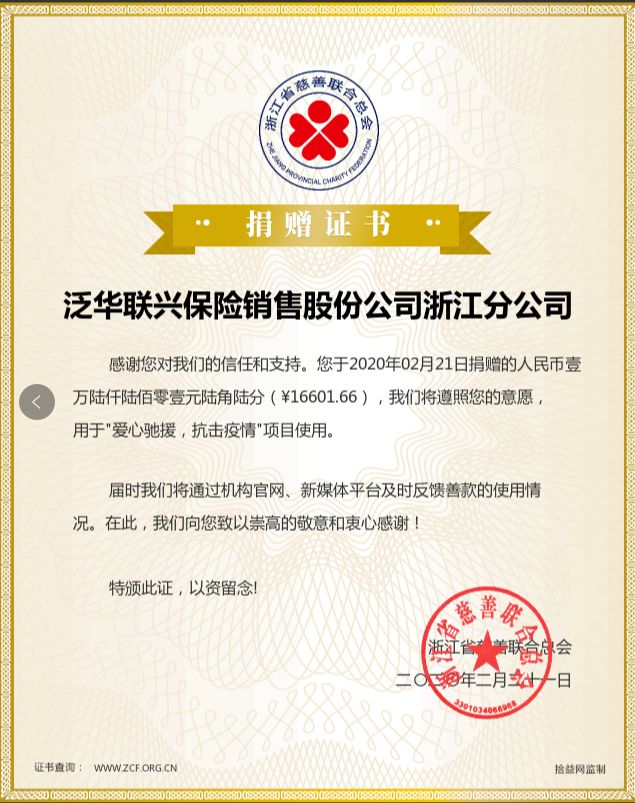 公司联合中国生命关怀协会保险社会服务工作委员会推出《浙江人抗疫自卫战》公益项目,通过H5链接发动了10001名客户,筹集到善款16601.66元,捐赠至浙江省慈善联合总会,同样用于采购抗疫一线人员的防护物资。