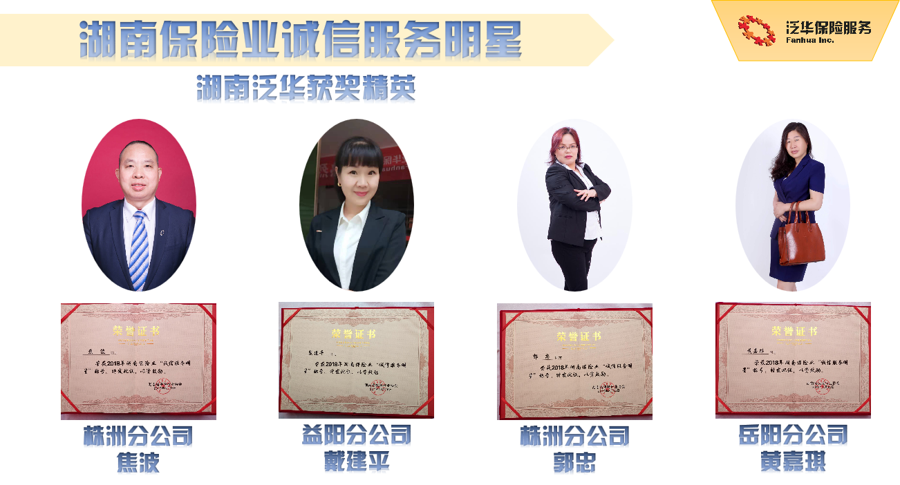 会议通报了“2018年度湖南保险业十大典型理赔案列”和“2018年湖南保险业十大反欺诈典型案列” ,号召市民强化风险意识,合理购买保险、理性维权,要求各保险公司和经代公司,加强防范风险。同时,为了进一步规范市场秩序,优化金融生态环境,树立保险业正面积极的形象,发挥应有功能,以更好地满足人民群众日益增长的美好生活需求,此次会议也对获奖的保险诚信服务明星及机构予以表彰,并颁发荣誉证书。湖南泛华株洲刘勇团队荣获“湖南省保险业诚信服务团队奖”。同时获得“湖南省保险业诚信服务明星”荣誉称号的泛华代理人分别有:焦波、戴建平、郭忠、黄嘉琪、刘海英、满秀云、魏艺。