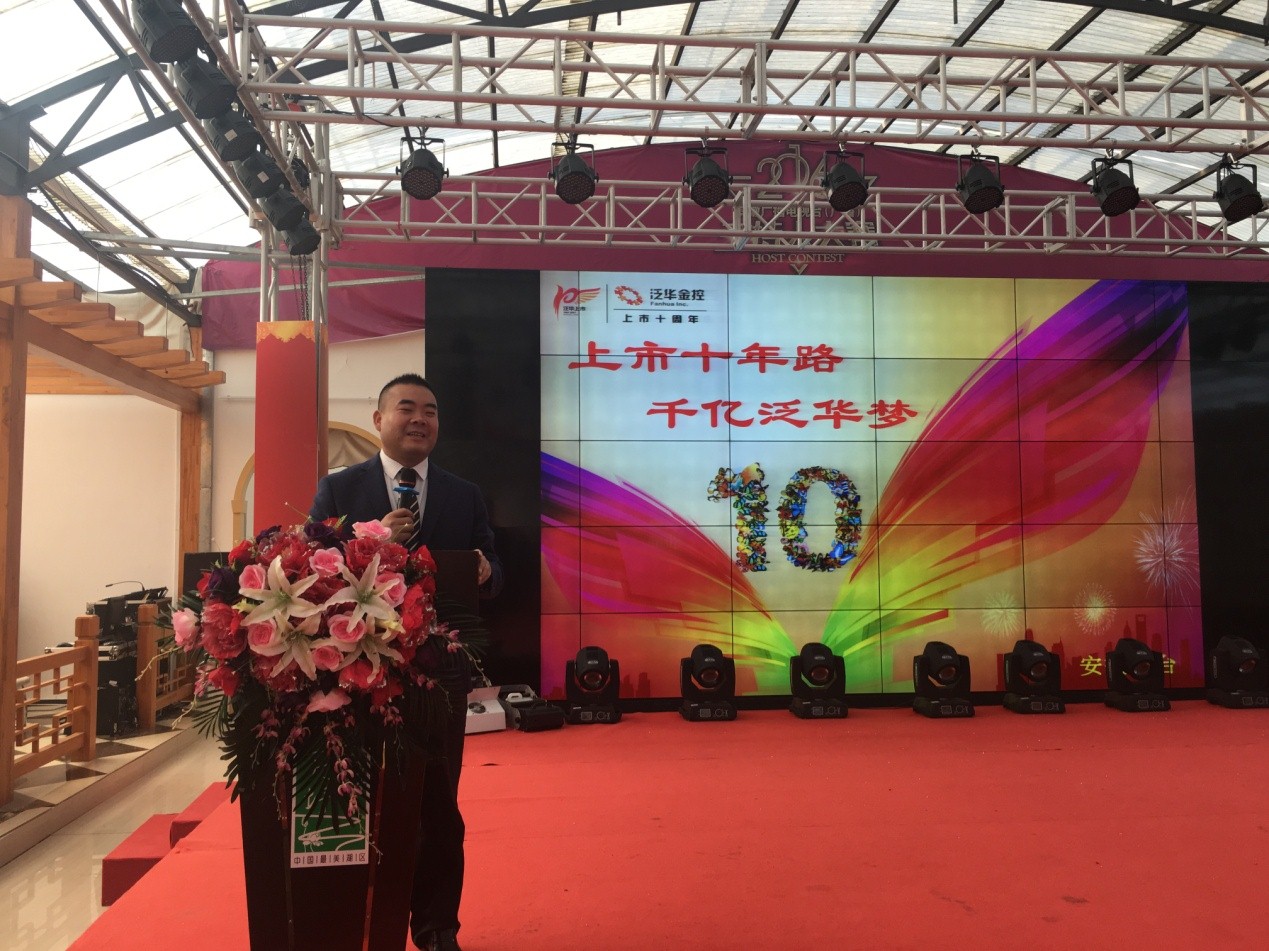 泛华金控安徽平台总经理室李雪山对本次活动发表致辞道,2017年10月31日这个特殊的日子,是泛华金融控股集团上市10周年的日子,对于每一个泛华人来说,是欣喜的、是激动的。对于每一个泛华人来说,也是圆梦的日子。