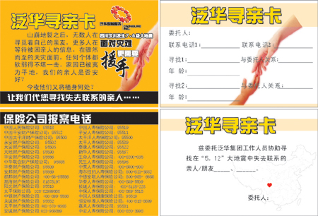 在几次前往都江堰的途中,我们发现灾害发生后,当地人民不仅失去了家园,更由于通信暂时中断而无法与失散的亲人联系,正疲于四处奔波打探亲人的消息。四川泛华鑫泰身处灾区,想四川人民之所想,急四川人民之所急,集思广益特别制作了“泛华寻亲卡”(图)。借助四川泛华鑫泰在四川全省十多个地区广泛的营业分布,泛华工作人员将把“泛华寻亲卡”免费发放到人们手中,以协助群众尽快找到自己的亲人与家属。除此之外,依托保险中介的服务优势和人脉优势,为了协助保险公司快速理赔,“泛华寻亲卡”还登录了四川范围内的保险公司的报案电话,以方便受灾群众在能够通讯的情况下第一时间与保险公司取得联系并顺利报案获得理赔。