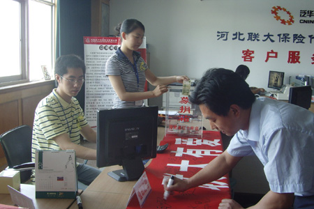 5月19日14时28分河北联大全体泛华员工默哀 这一刻,四川汶川大地震发生的同一时刻,河北联大保险代理有限公司组织全体员工及在场所有代理人齐聚业务处理中心,进行了庄严肃穆的默哀仪式。全体泛华人员神情凝重地向遇难同胞默哀3分钟。伴着窗外的鸣笛和警报声,一幕幕让人揪心的画面再次浮现眼前,每个人都为同胞遭受如此惨痛的苦难而感到万分心痛。 黄丝带“祈盼亲人平安” 默哀结束后,河北联大保险代理有限公司联合河北省红十字会开展的“出一张保单,献一份爱心”黄丝带活动正式启动。河北联大总经理刘亚红、副总经理李涛带头再次捐款,成为了河北联大在积极响应集团号召组织员工捐款之后的又一善举。 河北省红十字会在河北联大客户服务中心承保柜面设立了专用募捐箱,代理人每出一张保单或推荐一名有效会员,河北联大将为灾区捐一元钱,出单会员将获赠联大送出的象征“祈盼亲人平安”的黄丝带,并在“地震无情,联大有爱”的条幅上签下自己的名字。活动还鼓励代理人及客户直接捐款援助灾区。 “地震无情,联大有爱”签名 活动一经推出,受到了广大代理人的高度评价和大力支持,通过做好自己的本职工作为灾区献爱心成为大家的共识。仅19日当天就有28名代理人出单,累计保单60多件,不少会员还向灾区捐出了部分佣金和推荐奖。 河北联大员工纷纷表示,将以更加饱满的热情积极投入到工作中去,以实际行动支持灾区,珍惜每一天,与四川同胞一起加油! 河北联大21日孙海洋、李晶报道