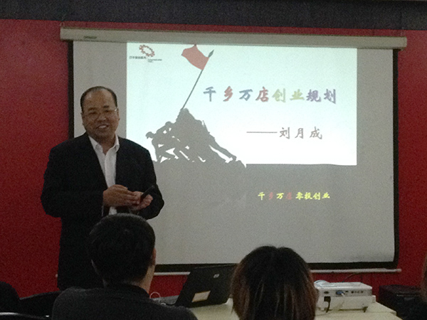 培训部吕抒雁老师进行简洁明快的开训后,千乡万店项目组组长、保定地区负责人刘月成总以千乡万店的创业规划打开了培训的篇章,“千乡万店,我们人在哪里,店面就在哪里,用掌中保将全面金融产品送进千家万户,让我们的梦想奔跑起来!”通过对千乡万店项目规划的讲解,让各位经理们了解泛华创业平台巨大优势。