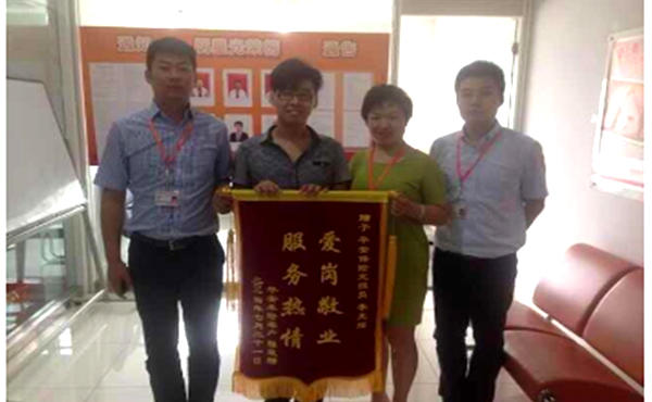 天津平安查勘作业室主任王鹤凌(右二)、公估对接岗高博(右一)向我司查勘员赠送锦旗