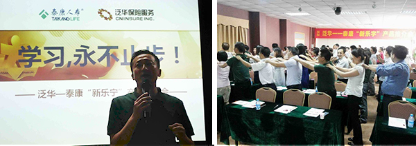 东莞公司负责人马远征总做开训致词,泰康广州经代负责人郑毅及泰康人寿总部资深讲师郝亿维针对泰康“新乐宁”产品的亮点及服务进行授课。现场针对“新乐宁”产品学习后进行心得分享,各代理人积极上台发言,集思广益并上台分享,代理人对这款“保费低,保障高,纯重疾保障的保险产品”充满信心。