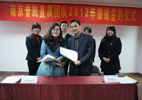 在庄严的声乐中举行了 “南京誉凯直属团队2012年绩效签订仪式”,各团队负责人分别代表本团队与汤总签订了2012年度绩效合约。