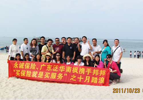 2011年10月22日至23日,永诚保险、广东泛华南枫携手邦邦汽车服务推出的服务卡推广旅游奖励活动 ——“买保险就是买服务”系列之“十月踏浪”奖励活动在惠州巽寮湾顺利举行。在2011年7月25日至9月30日期间,通过广东泛华南枫投保永诚保险业绩位列前茅的广东泛华南枫13位业务精英,都获得了参加本次活动奖励资格。