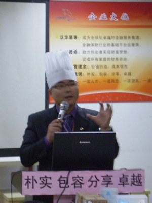 上海泛华戎总为了烘托蟹宴的轻松气氛,特地戴上了厨师帽上台演讲。他对第三季度入围的业务同仁表示了祝贺,并勉励大家再接再厉准备第四季度的最后冲刺。