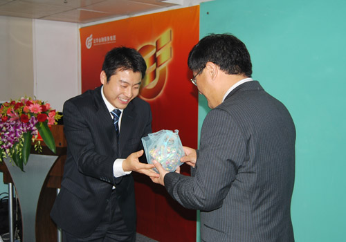 临沂泛华带头人,也是平台长王中强代表临沂全体伙伴向胡义南董事长送上了员工亲手折叠的365颗“幸运星”和《孙子兵法》竹简。