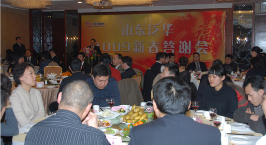 为感谢各界人士对山东泛华的支持和帮助,山东泛华于2009年1月16日,在济南举办了2009山东泛华新春答谢会。山东省监管部门领导、山东省保险行业协会领导、合作保险公司领导、合作新闻媒体领导都参加了新春答谢会。泛华集团副总裁兼泛华寿险第一营业集团总裁李成斌、督导部总经理杨频、山东泛华公司及各分支机构领导悉数到会参加。高朋满座,嘉宾齐聚一堂。答谢会在山东泛华刘全杰总经理的祝福语中拉开序幕。