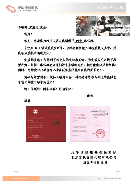 5.12汶川大地震后,泛华保险服务集团旗下北京富民保险代理有限公司全体员工积极响应,组织并参与了各种形式的捐赠活动。除开展向灾区捐款活动外,为抚慰灾区儿童的心灵,北京富民已通过中华慈善总会,捐赠价值过万元的各类图书总计639册,用于灾区儿童心理救助和中小学阅览室的灾后重建。