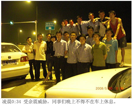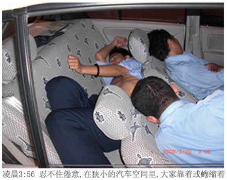 直至20日,普邦四川办事处的同事已经连续多天轮班坚持在理赔救助第一线,17名车险员工每晚风餐露宿,在狭小的汽车空间里,大家靠着或蜷缩着,半睡半醒的挺到天明,短暂休息过后第二天又全心投入工作中。