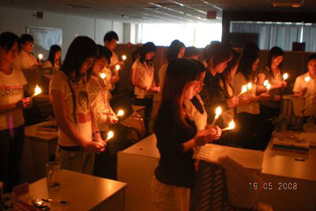 5月19日下午,东莞市南枫佳誉保险代理有限公司虎门分公司全体员工,在虎门职场为灾区人民进行祈福,悼念5.12四川大地震中的遇难者。员工们手持点燃的蜡烛,默念祈福语,为灾区人民送去最真挚的祝福。 东莞市南枫佳誉保险代理有限公司虎门分公司全体员工为灾区人民祈福 东莞虎门19日杨旭志报道