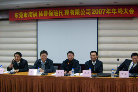 2008年元月26日,东莞南枫佳誉2007年终总结暨优秀员工表彰大会在东莞市华凯广场会议厅召开。泛华保险服务集团旗下东莞南枫佳誉各领导及全体员工共200多人参加会议,集团总裁赖秋萍、副总裁兼财险经营委员会主席汪春林、首席信息运营官金锋参加了大会。