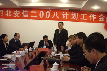 早在12月26日至28日,来自7个地市的总经理及业务副总就齐聚石家庄,就2008年寿险和财险的工作思路、经营目标、考核办法及薪酬管理办法等方面进行了为期两天的交流和研讨,并为安信2008年的发展建言献策、集思广益,为开好本次会议奠定了良好的基础。