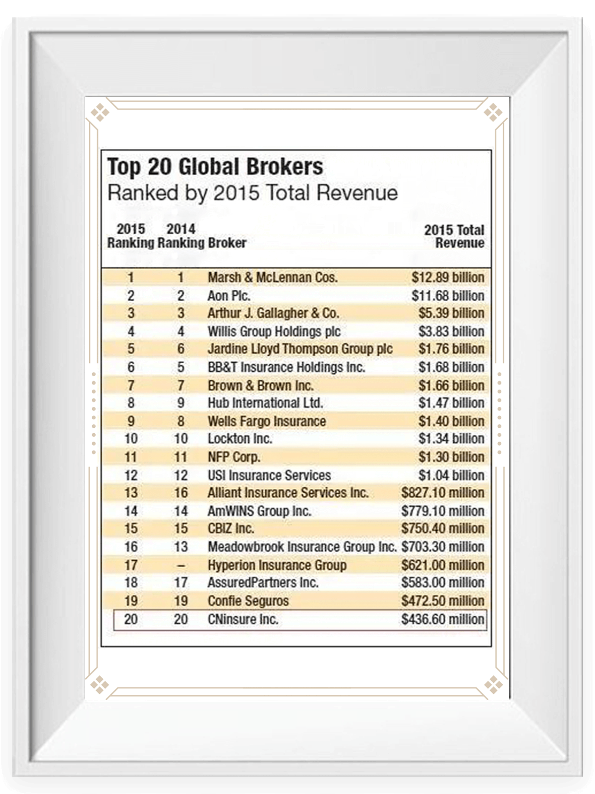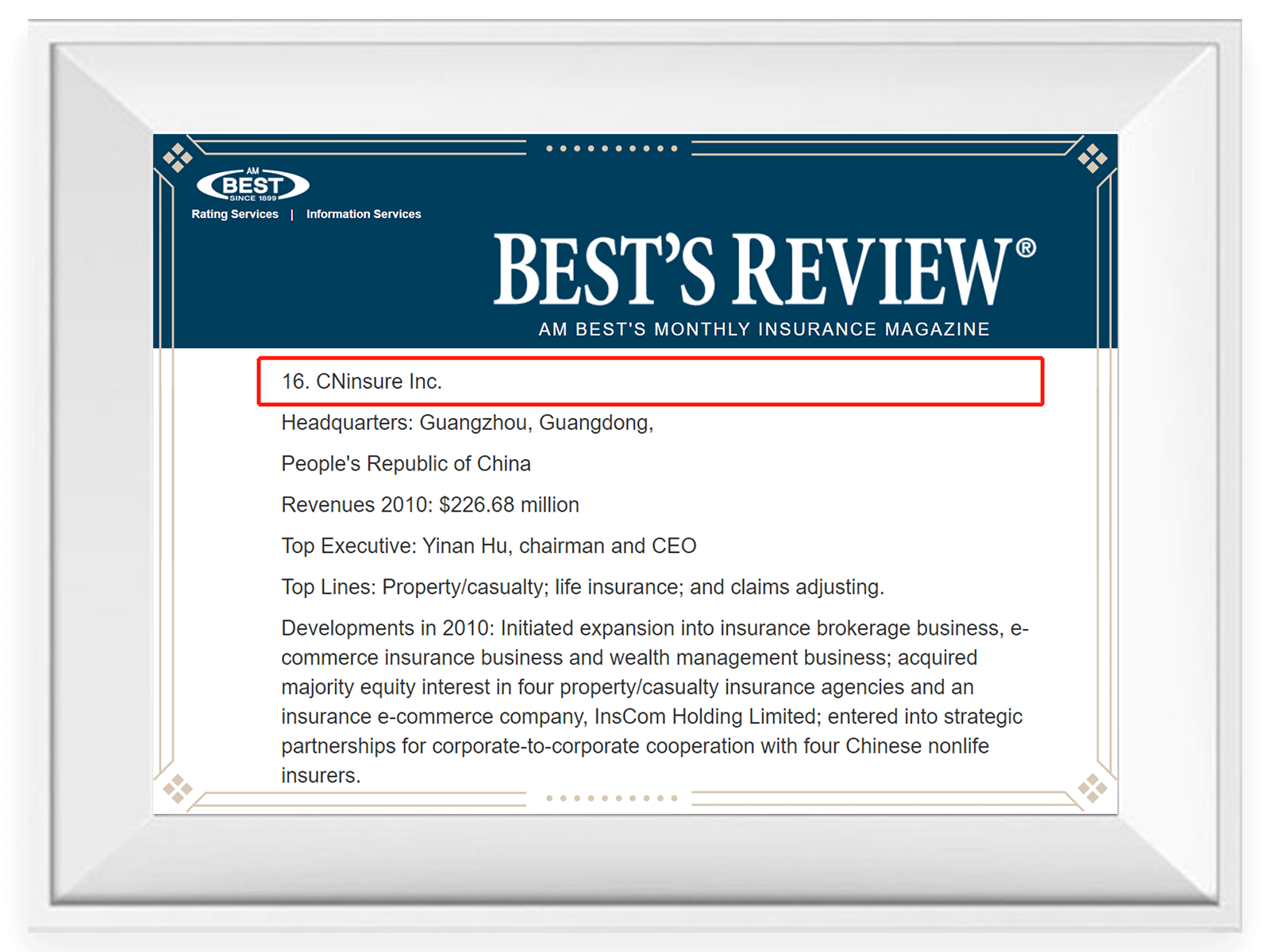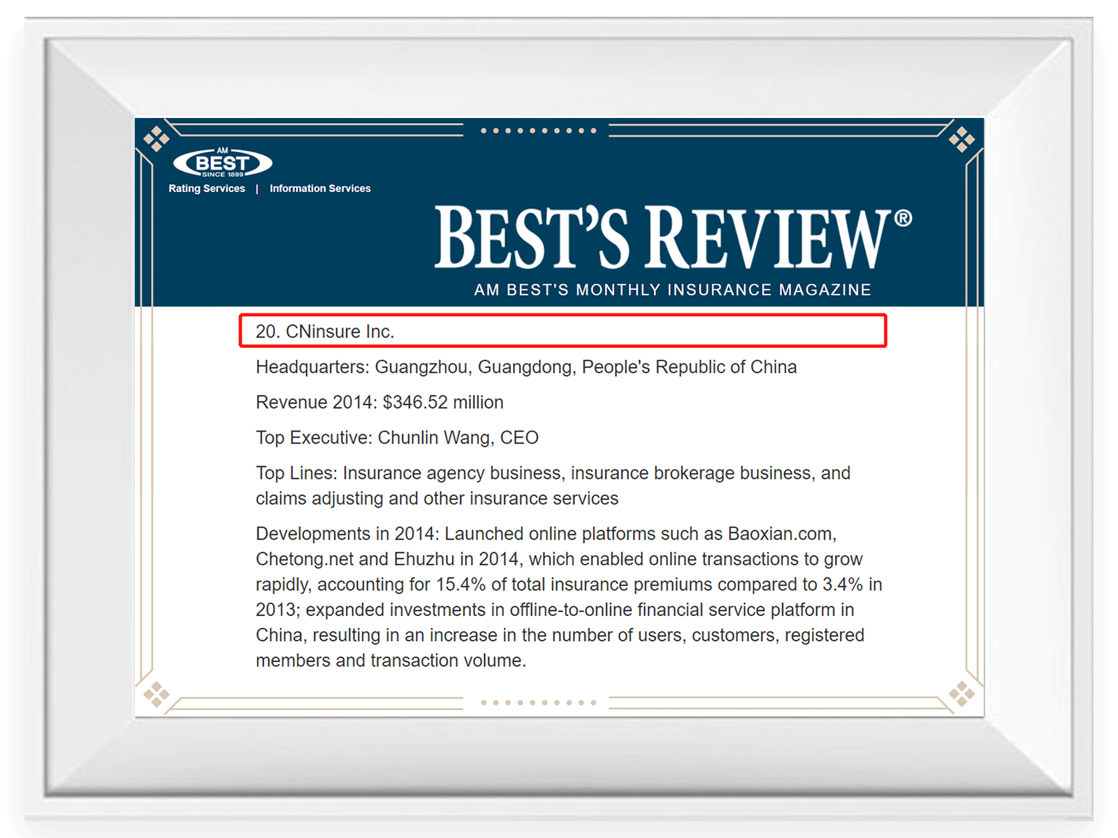泛华被著名评级机构贝氏公司评为全球前20大保险经代公司(连续四年、亚洲唯一入选)