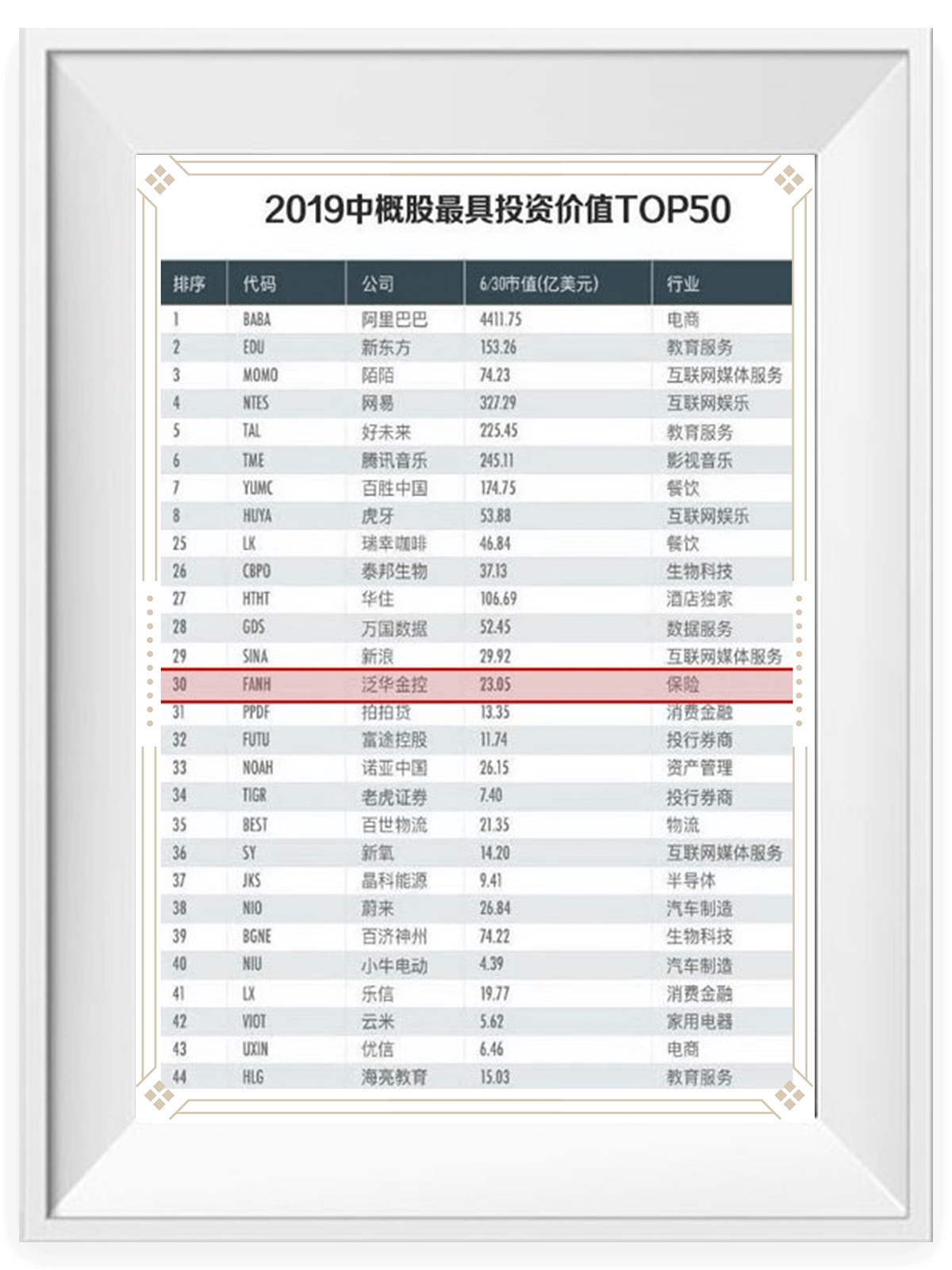 泛华登榜中概股最具投资价值TOP50,股票回报率排列第三位
