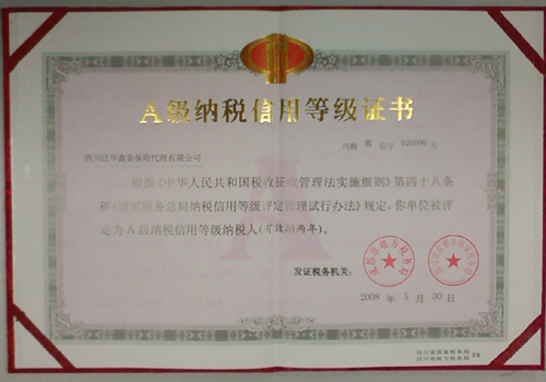 A级纳税信用等级证书是四川省成都市国家税务局、成都市地方税务局根据纳税信用等级评定的相关规定,经申报、初审、复审、公示等8项程序后评定的,是国家税务总局授予纳税信用企业的一项较高荣誉。
