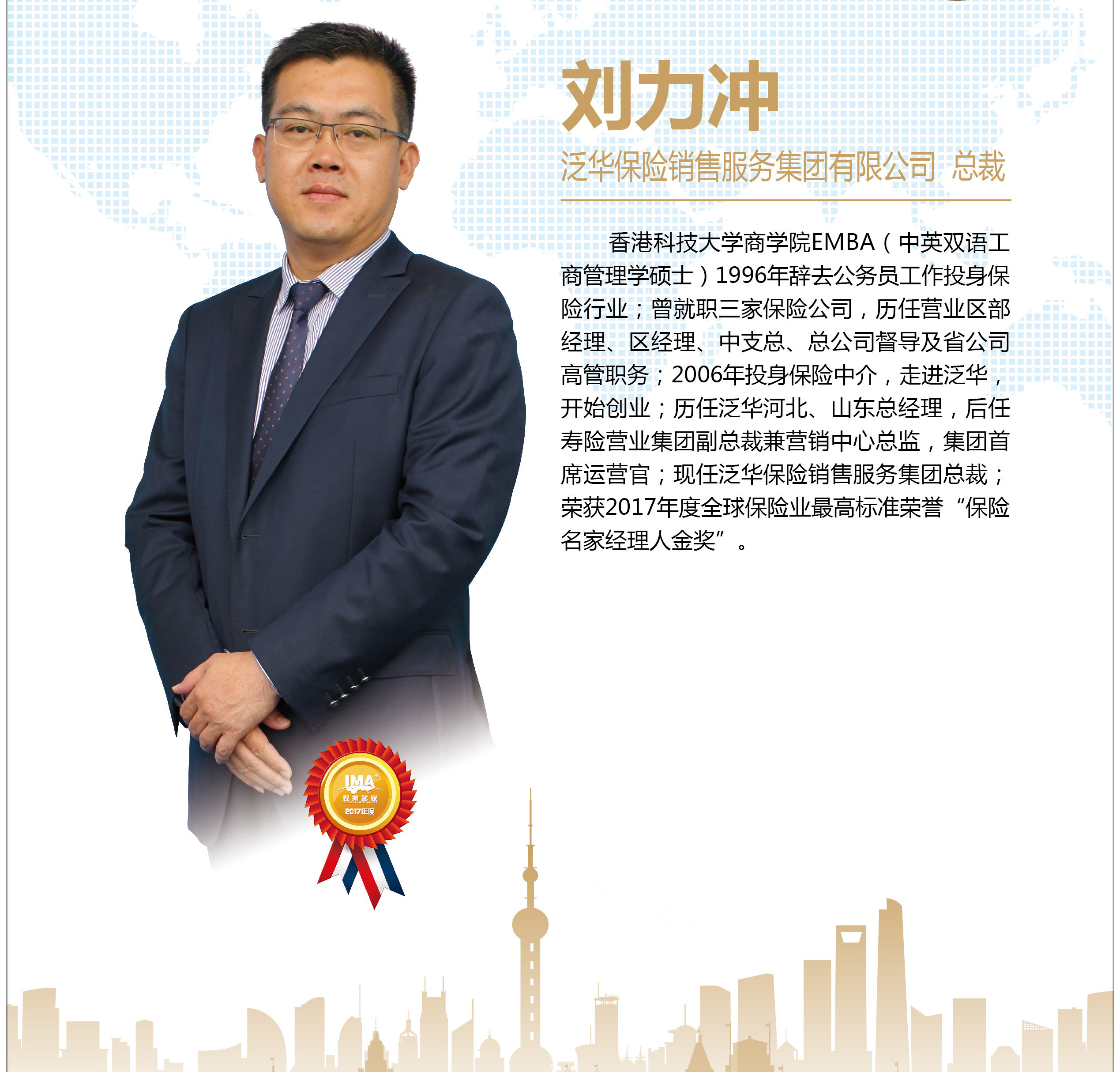 颁奖大会上泛华保险销售服务集团有限公司总裁刘力冲先生荣获“保险名家经理人金奖”。据悉,国际保险节“保险名家”评选开创行业之先河,旨在发现和表彰那些为“中国保险业发展和经营水平提高”做出卓越贡献的人物群体。其评奖标准有别于其它奖项的内涵,并非单一考核评选者的业绩多寡,而是全面考核其综合素质、专业能力、服务理念、信用记录、价值贡献等,达标者万分不及其一,凤毛麟角,寥若星辰。