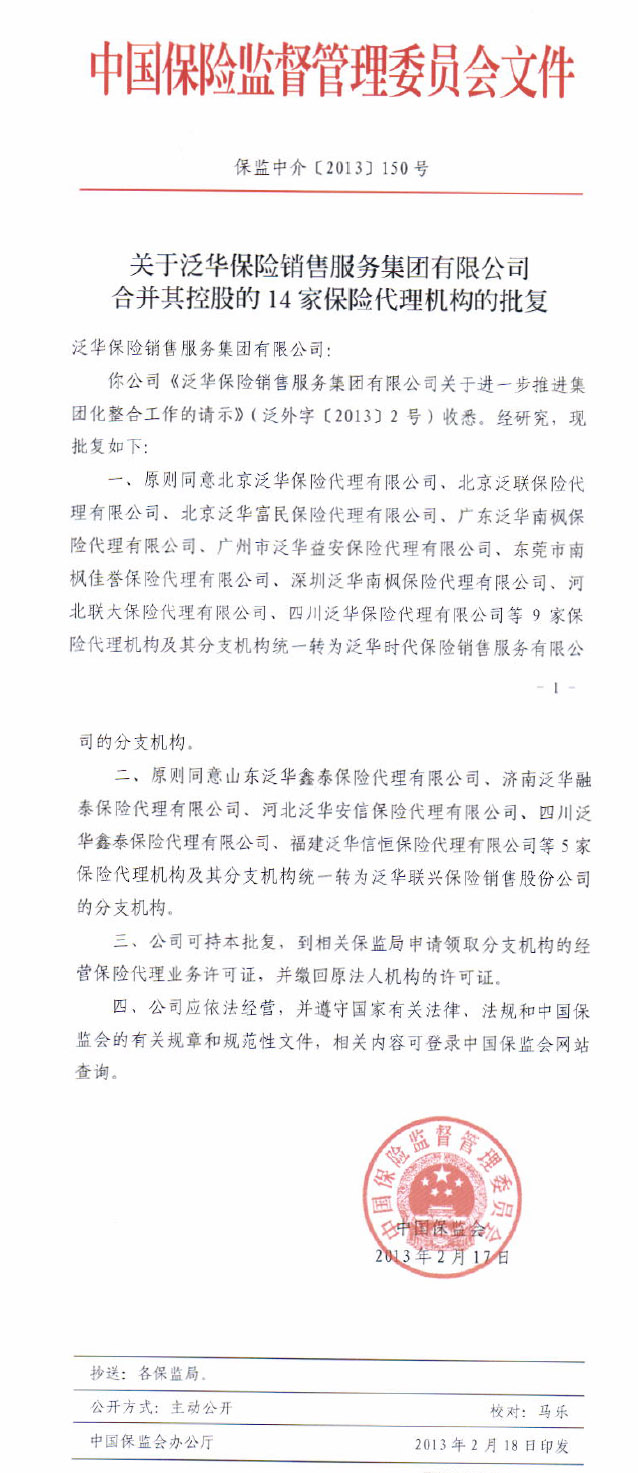 关于泛华保险销售服务集团有限公司合并其控股的14家保险代理机构的批复