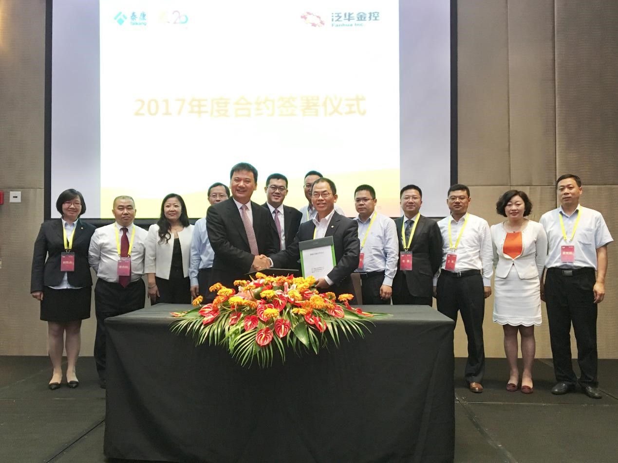 2017年1月11日,泛华泰康2016年合作总结暨2017年战略合作研讨签约大会在三亚举行,泰康保险集团副总裁邱希淳、泰康人寿健康保险事业部经代管理部总经理黄晓强,泛华金融控股集团CEO汪春林、集团COO刘力冲、集团副总裁赵勃、多家泛华省级平台总经理与泰康人寿分公司经代负责人出席了会议。