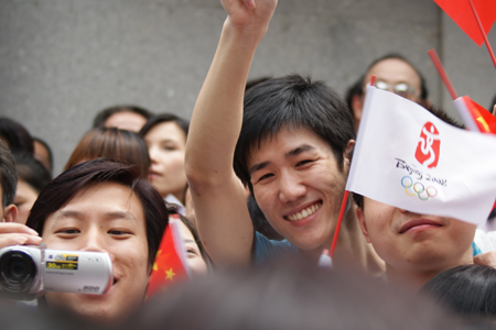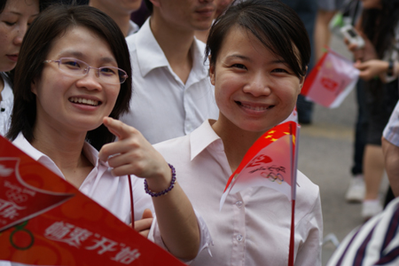 现场人数比想象的还要多很多,老人、小孩、妇女、学生、上班族……,人们的热情比想象得还要更加热烈,人挨人、人挤人、汗流浃背、却抑制不住内心的激动和喜悦,每到一辆排头车都能引起人们的一片欢呼。当圣火到达天字码头站交接传递的时候,人们的热情一触即发,不约而同的高呼:中国!加油!中国!加油!……这群可爱的中国人分不清种族和地域,也分不清男人还是女人的声音,都淹没在祝福中国奥运的声海中。