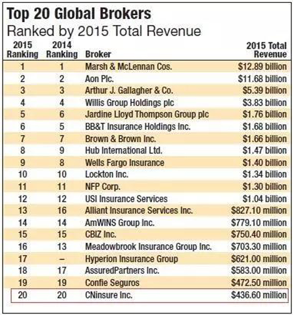 2016年8月,国际著名评级机构贝氏评级公司(A.M. Best )根据2015年总营业收入,评选出全球排名前20大保险经代公司。