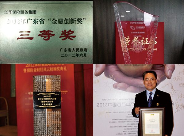 2012年6月,泛华凭借保网()项目荣获2011年度广东省“金融创新奖”三等奖,成为国内保险中介行业里唯一连续获得政府奖励的企业。此外,泛华屡获行业创新大奖,分别获评为 “2012年度最佳中介公司”(第 10届“中国财经风云榜”)、 “2012年度中国最佳保险代理公司”(2012中国百万中产家庭首选保险品牌),并荣获“2012年度文化管理创新奖”(第7届中国保险创新大奖)。