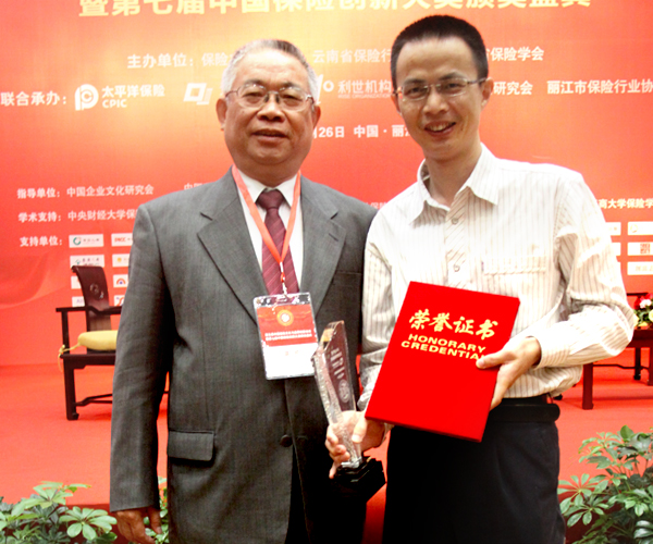 前中国保险学会罗忠敏(左)会长颁发“中国保险创新大奖”