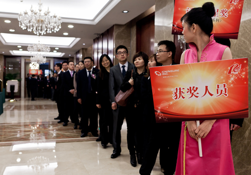 随后,晚会进入最激动人心的颁奖环节。先由泛华集团赖秋萍总裁宣读《嘉奖令》,接着颁发了包括泛华新星奖、泛华银星奖、泛华金星奖、最具成长潜力奖、优秀员工奖、优秀经理人奖、优秀团队拼搏奖、优秀机构奋斗奖、泛华年度之星奖、以及泛华十年忠诚服务奖、特别奖(保网试运行上线最佳建设贡献奖、泛华勇士奖、创新奖)在内的11类奖项,共有198个优秀团体及个人获得表彰。其中,对获得2011年度“泛华十年忠诚服务奖”的员工颁发纯金司徽,以表达管理层对忠诚员工的感谢,这也是自2009年以来,泛华第三次给员工颁发金司徽奖励。纯金司徽象征着泛华的创业精神、创业文化永不变色,还要一代又一代的传承,让每一个泛华人永远铭记朴实、包容、分享、卓越的PA直营,永远保持着昂扬的创业激情和工作热情。