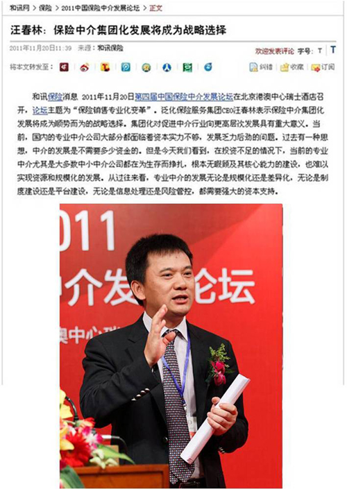 2011年11月20日,第四届中国保险中介发展论坛在北京港澳中心瑞士酒店召开。本次论坛受到中国保监会和各地保监局的高度重视,保监会法规部杨华柏主任、中介部赵庆晗副主任与河北、辽宁、广西、厦门、西藏等地的保监局领导,以及保监会中介部的施强处长、龙翔处长、朱英桃副处长和全国各地保监局中介处负责人一起与会。泛华集团CEO汪春林先生受邀与中外保险公司及中介机构的代表、专家学者等200位各界嘉宾一起参会,他还做了主题演讲。和讯、新浪、中国保险报等各大媒体都专题报道了论坛实况。(,)