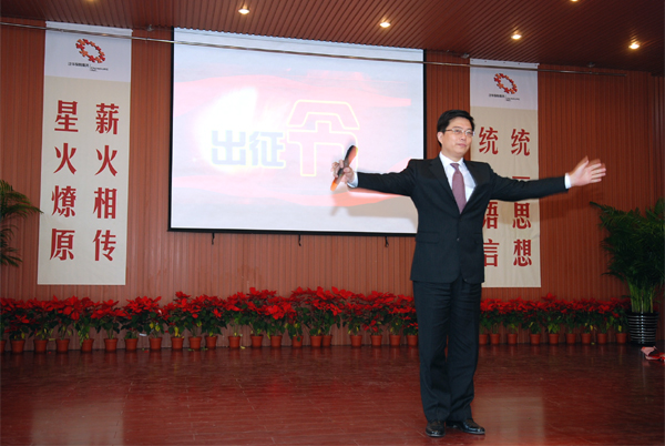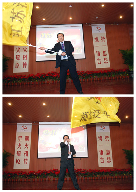 在会议结束的当天,寿险管理总部特别召开了“四五连动”启动大会和誓师大会。这下全场可就热闹开了,经过前两天的培训,这些创业团队长 “充电”后就积蓄了一身儿的干劲儿。誓师大会上,刘全杰副总裁发起动员令、搭起了擂台让各省都来比一比。