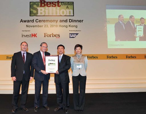 11月23日,由福布斯(亚洲)、香港投资贸易署和SAP公司联合举办的“亚洲最佳中小型公司”评选颁奖晚会,在香港四季酒店二层宴会厅举行。泛华保险服务集团(CNinsure Inc.)获颁“亚洲最佳中小型公司”奖项,位列所有上榜“亚太中小企业200强”企业的第39位,在入选的中国企业中位列第18位。泛华保险服务集团执行董事、总裁赖秋萍先生出席此次颁奖晚宴,并在现场接受了主办方的颁奖。