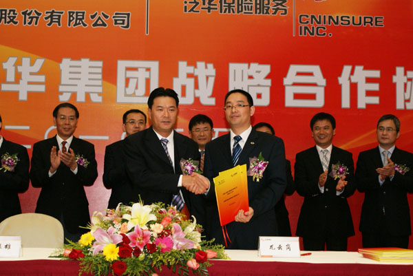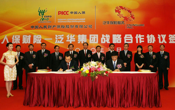 2010年5月13日,中国人民财产保险股份有限公司与泛华保险服务集团在广州举行了战略合作协议签字仪式。中国人保财险降彩石副总裁与泛华集团胡义南董事长出席仪式,并代表双方公司共同签署了合作协议。(专题链接:)